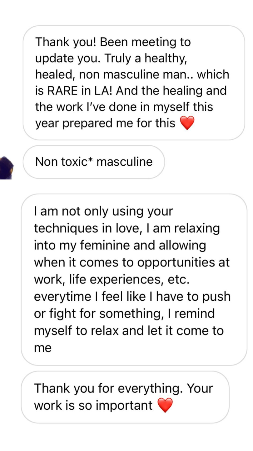 "Working with you was one of the best decisions of my life! I'm so grateful for YOU! I wouldn't be in this relationship if I hadn't done this work with you. Working with you was one of the top 3 best investments and choices I've made for myself"